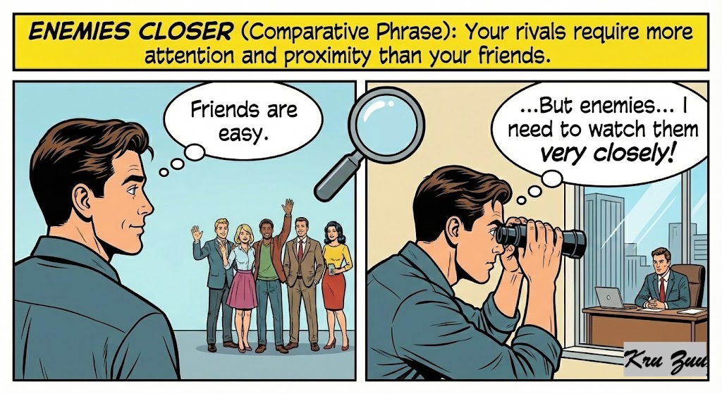 Enemies Closer (Comparative Phrase): Your rivals require more attention and proximity than your friends.