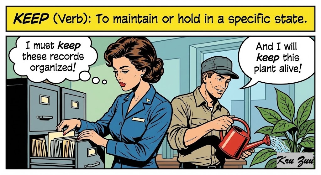 Keep (Verb): To maintain or hold in a specific state.