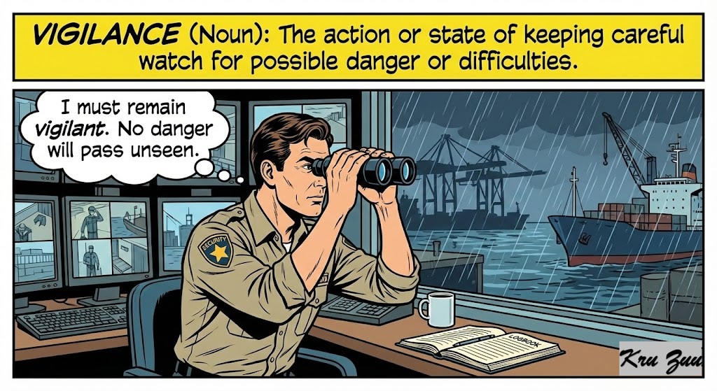 Vigilance (Noun): The action or state of keeping careful watch for possible danger or difficulties.