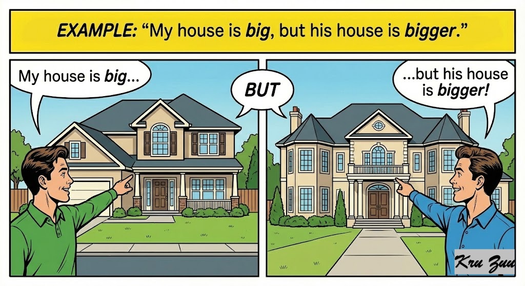 Example: “My house is big, but his house is bigger.”