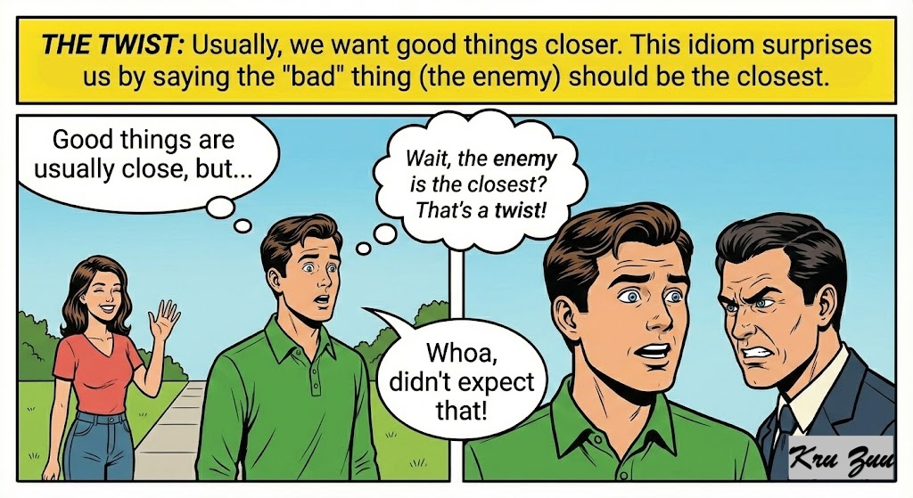 The Twist: Usually, we want good things closer. This idiom surprises us by saying the “bad” thing (the enemy) should be the closest.