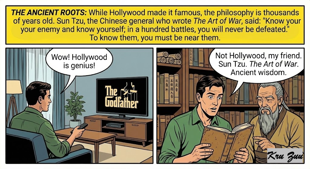 The Ancient Roots: While Hollywood made it famous, the philosophy is thousands of years old. Sun Tzu, the Chinese general who wrote The Art of War, said: “Know your enemy and know yourself; in a hundred battles, you will never be defeated.” To know them, you must be near them.