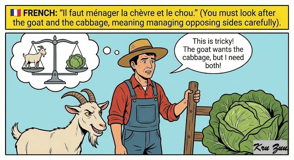🇫🇷 French: “Il faut ménager la chèvre et le chou.” (You must look after the goat and the cabbage, meaning managing opposing sides carefully).