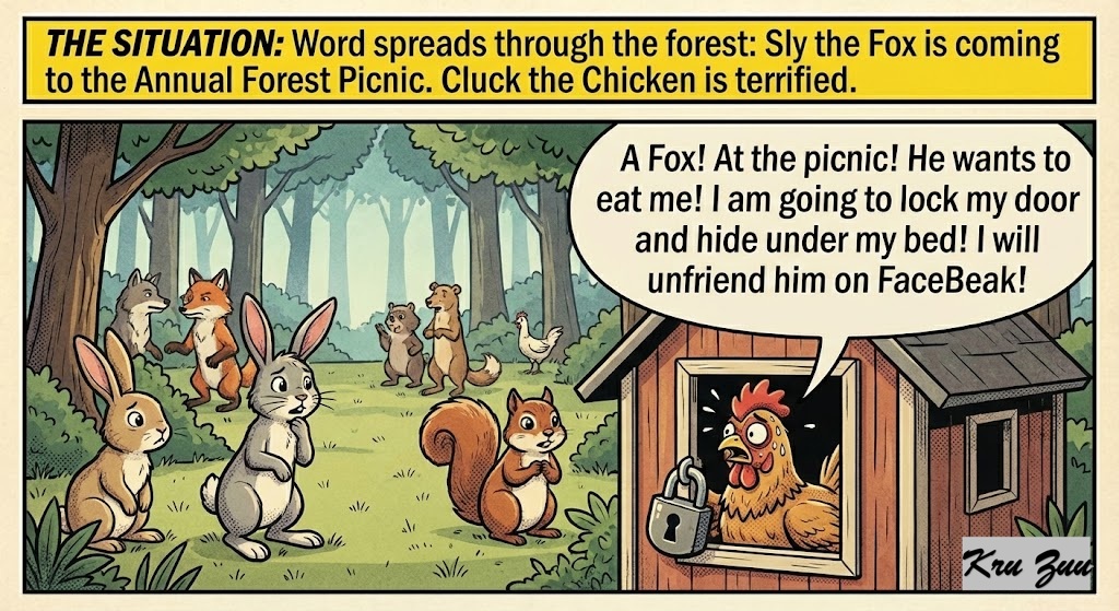 The Situation: Word spreads through the forest: Sly the Fox is coming to the Annual Forest Picnic. Cluck the Chicken is terrified. “A Fox! At the picnic! He wants to eat me! I am going to lock my door and hide under my bed! I will unfriend him on FaceBeak!”