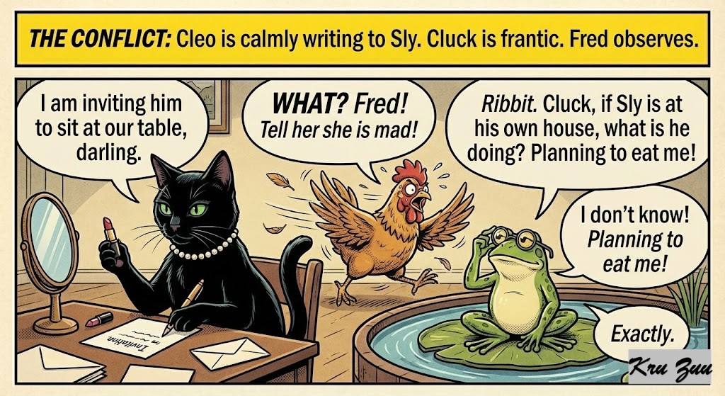 The Conflict: Cluck looks at Cleo. Cleo is calmly writing an invitation card. “Cleo!” Cluck screams. “Are you crazy? Why are you writing to Sly?” Cleo purrs, checking her lipstick in the mirror. “I am inviting him to sit at our table, darling.” “WHAT?” Cluck feathers fly everywhere. “Fred! Tell her she is mad!” Fred the Frog adjusts his glasses. “Ribbit. Cluck, if Sly is at his own house, what is he doing?” “I don’t know!” Cluck cries. “Planning to eat me!” “Exactly,” says Fred.