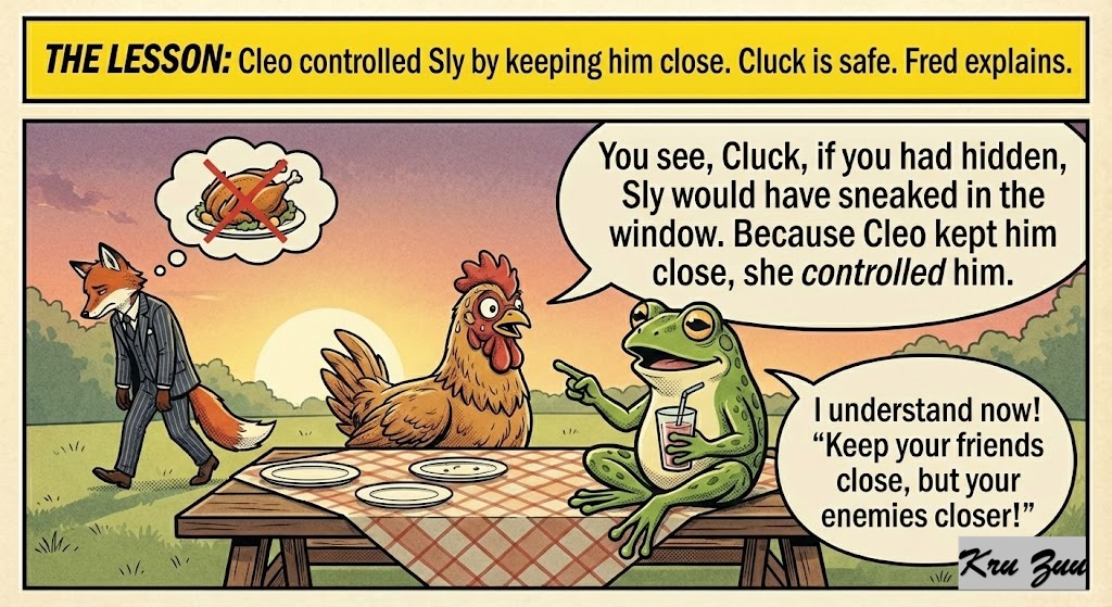 The Reaction: The picnic begins. Sly the Fox arrives. He looks hungry. Cluck wants to run, but Cleo waves a paw. “Sly! Darling! Sit right here next to me. Have some tea.” Sly is confused. He sits down. He smiles a fake smile. “Why, thank you, Cleo.” Because Sly is sitting at the table, he has to be polite. He has to drink tea. He cannot sneak around the bushes. He cannot set traps. Every time Sly looks at the delicious Cluck, Cleo taps his paw. “More sugar, Sly?” She watches his eyes. She sees exactly what he is looking at.