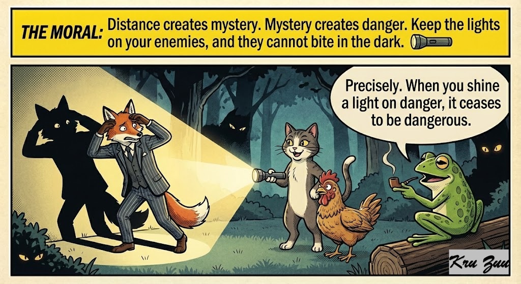 The Moral: Distance creates mystery. Mystery creates danger. Keep the lights on your enemies, and they cannot bite in the dark. 🔦