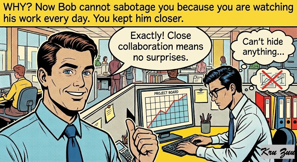 Why? Now Bob cannot sabotage you because you are watching his work every day. You kept him closer.