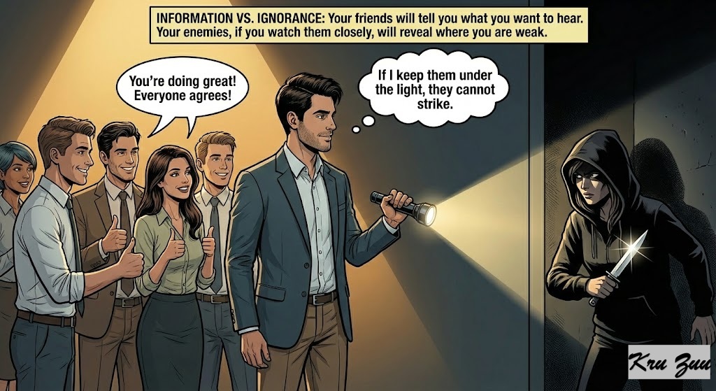 Information vs. Ignorance. We live in a world where we want to surround ourselves only with people who agree with us. It feels safe. But in business, negotiation, and life, ignorance is dangerous. Your friends will tell you what you want to hear. Your enemies, if you watch them closely, will reveal where you are weak. If you push your enemy into the shadows, you cannot see the knife. If you keep them under the light, they cannot strike.
