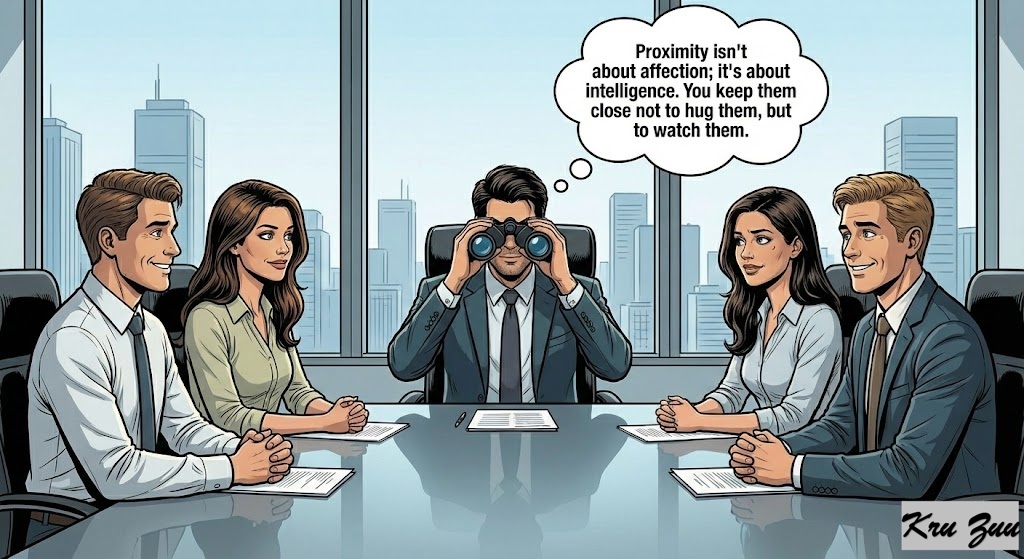 You see a rival. You pause. 🛑 Instead of pushing them away, you invite them to lunch. You smile. You engage. You think: “If they are near me, I can see their hands. If they are near me, I know what they are thinking.” You don’t do this out of love; you do it out of strategy.