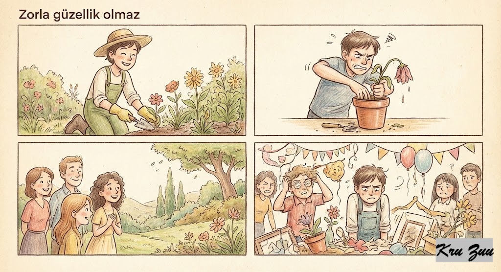 🇹🇷 Turkish: “Zorla güzellik olmaz.” (Beauty cannot be forced/There is no forced beauty.) OR “Zorla kuyu kazılmaz.”