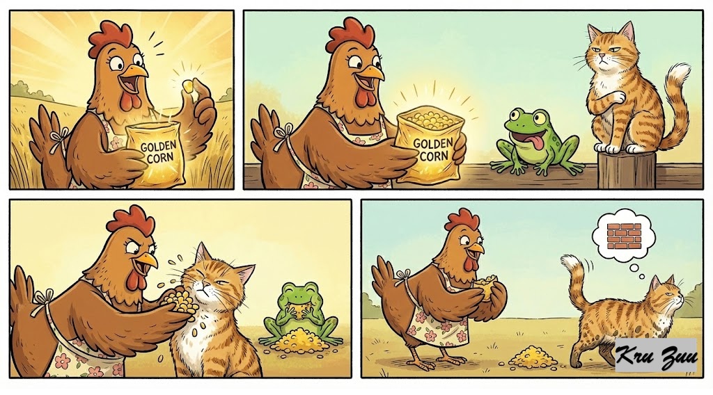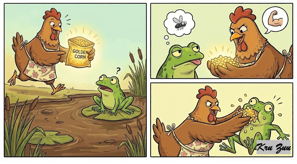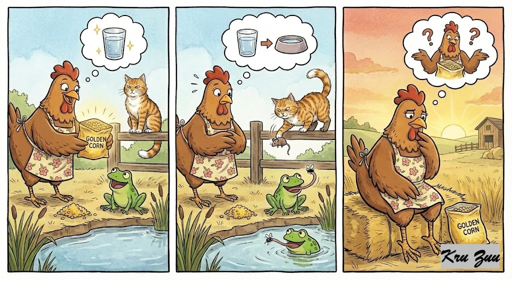 The Moral: Mrs. Hen had good intentions (The Water). But a Frog and a Cat have different needs (The Drinking). Mrs. Hen wasted her day trying to turn a Cat into a Chicken. Don’t be Mrs. Hen. Offer the corn, but don’t force the feast. 🌽