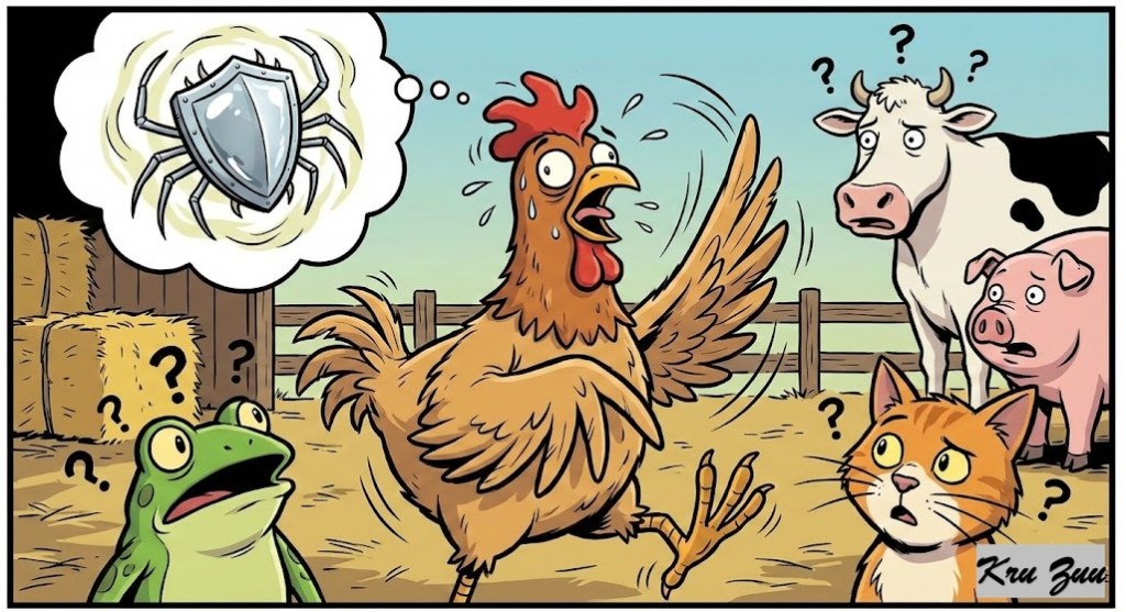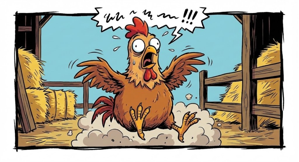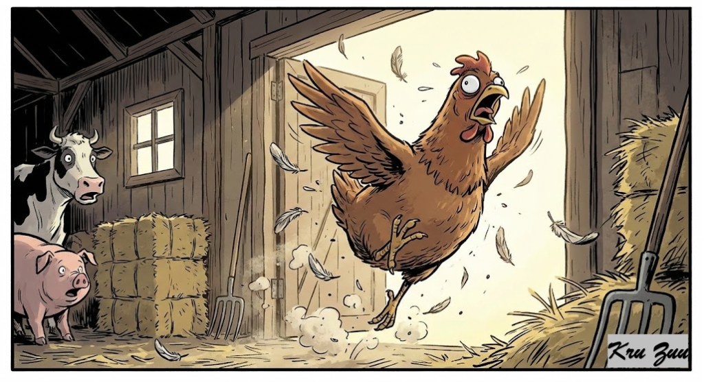 π The Incident: One morning, Clucky ran into the barn, feathers flying everywhere. She had seen something terrifying in the forest.
