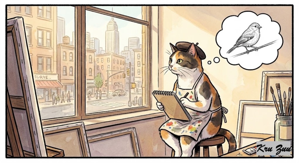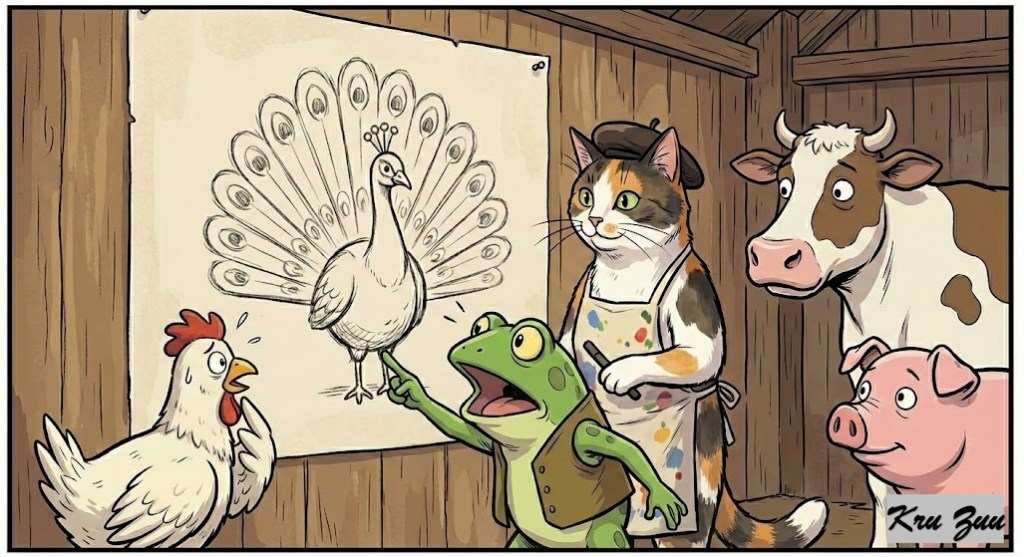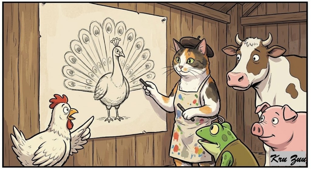 The Resolution: Whiskers the Cat walked in. She didn’t say a word. She took a piece of charcoal and drew a quick sketch on the wooden wall. A round body, colorful feathers spread out like a fan, and tiny feet.