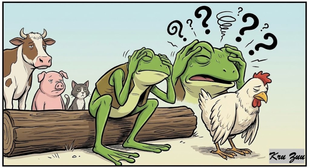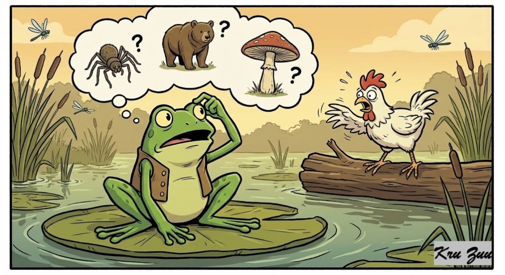 Croak the Frog sat on a lily pad, confused. “Clucky, was it a spider? A bear? A very large mushroom?”