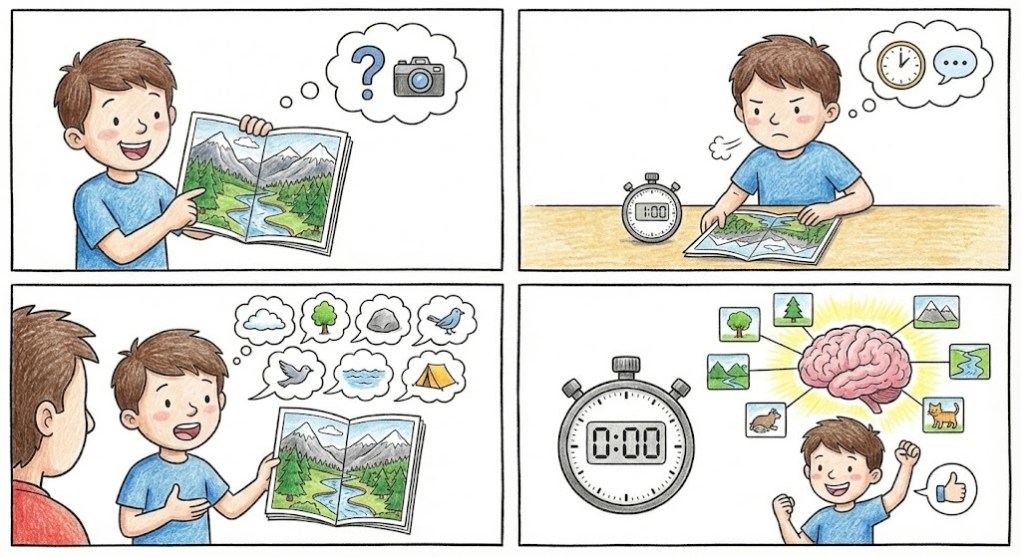 Describe Photos: To practice speaking, find an interesting photo and try to describe it for 1 minute. This forces you to find the right vocabulary.