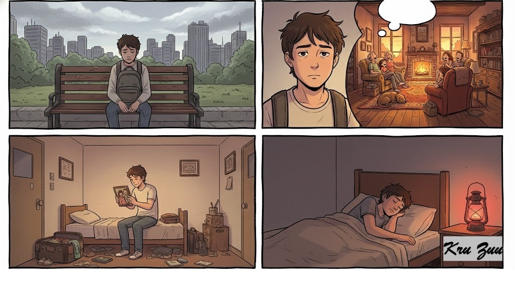 Homesick (Adjective): Feeling sad because you are away from your home.