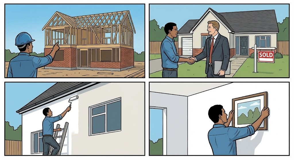 Example: “I bought a new house.” (You bought the walls and the roof).