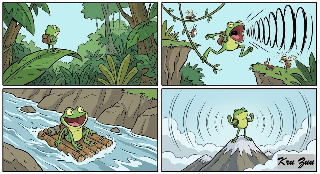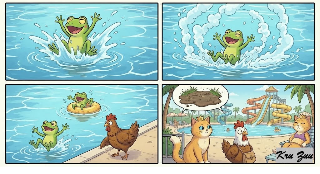 Croak jumped in happily. But the water was full of chlorine chemicals, not tasty flies and mud. “It burns my skin! It’s too clean!” he croaked.