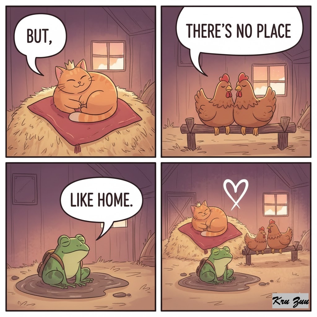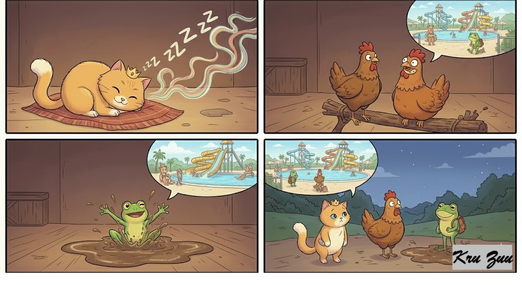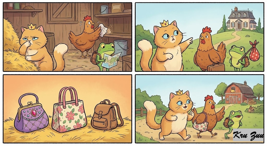 The Setup: They lived on a cozy, messy farm. One day, Cleo said, “This barn smells like hay. I deserve luxury! Let’s find a better place.” Cluck and Croak agreed. They packed their bags.