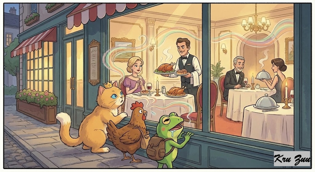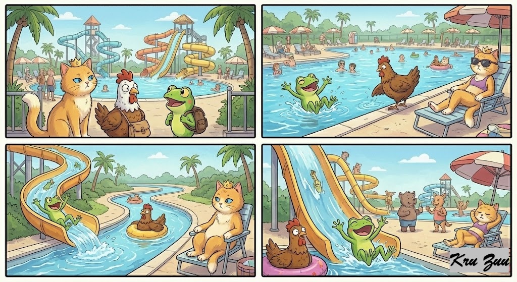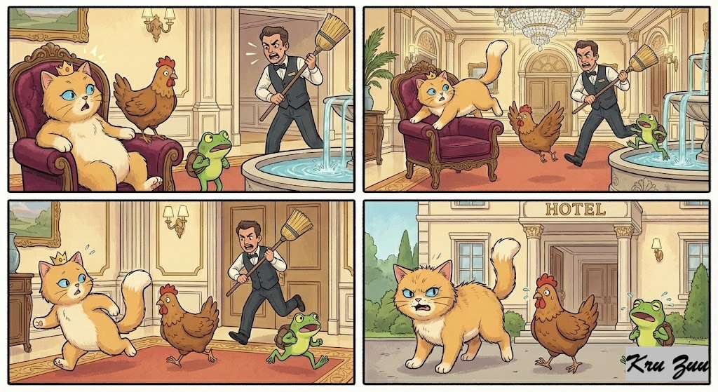 Cleo purred louder than a tractor. “The hotel was rich,” Cleo said. “The restaurant was famous,” Cluck added. “The pool was big,” Croak noted.