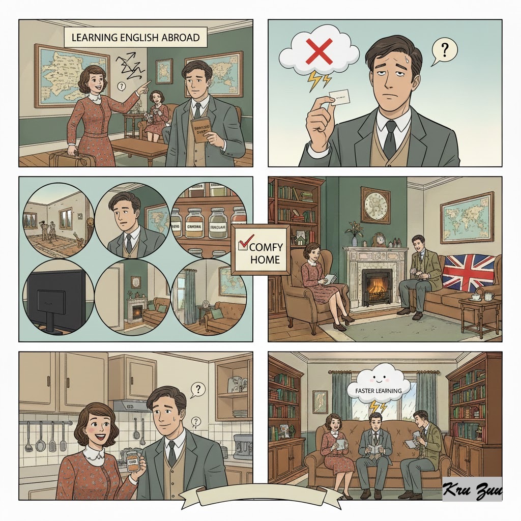If you make English a part of your comfortable home life, you will learn faster than if you treat it like a stressful trip.