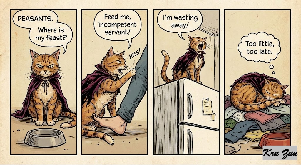 😼 Whiskers (The Cat): Hungry, arrogant, and impatient.