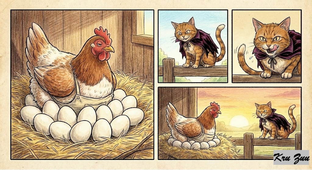 The Scene: Mrs. Pecks was sitting on 12 big, white eggs. She sat quietly, keeping them warm. Whiskers the Cat watched from the fence, licking his lips.