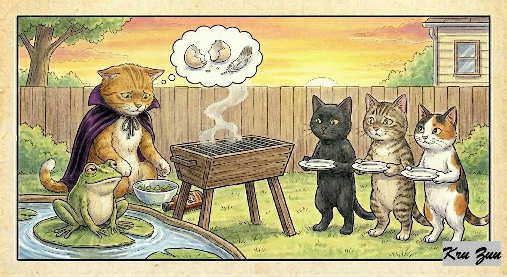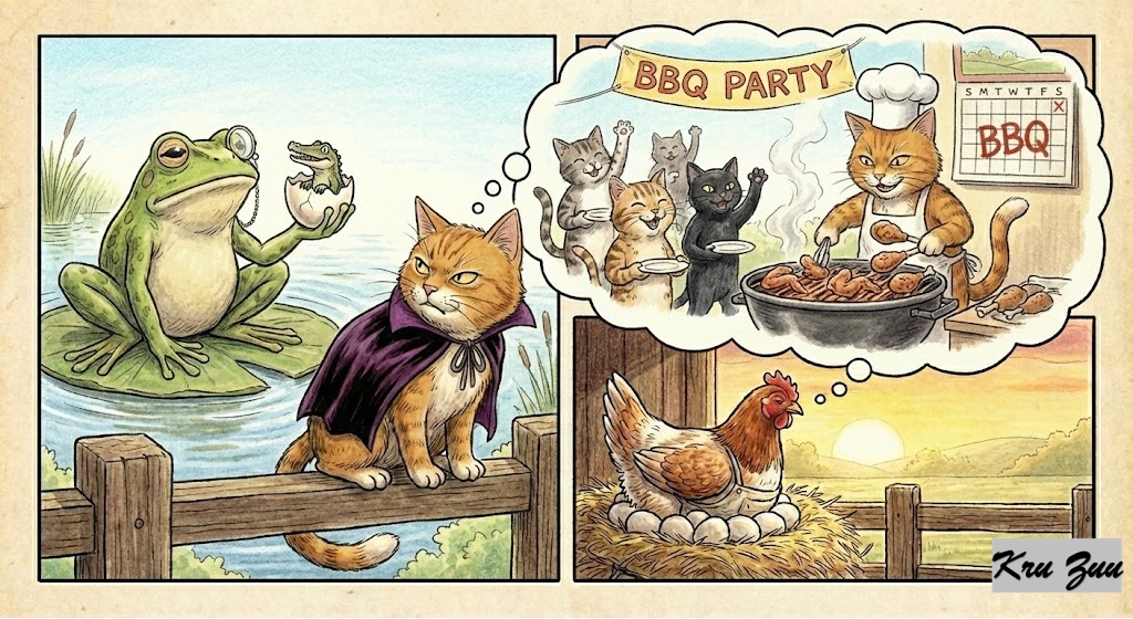 Croak (The Frog): “Ribbit. Careful, cat. Nature is unpredictable. Not every egg holds a chick.” Whiskers: “Quiet, you slimy green thing! I am already inviting my friends for a BBQ. I can taste the wings already!” 🍗