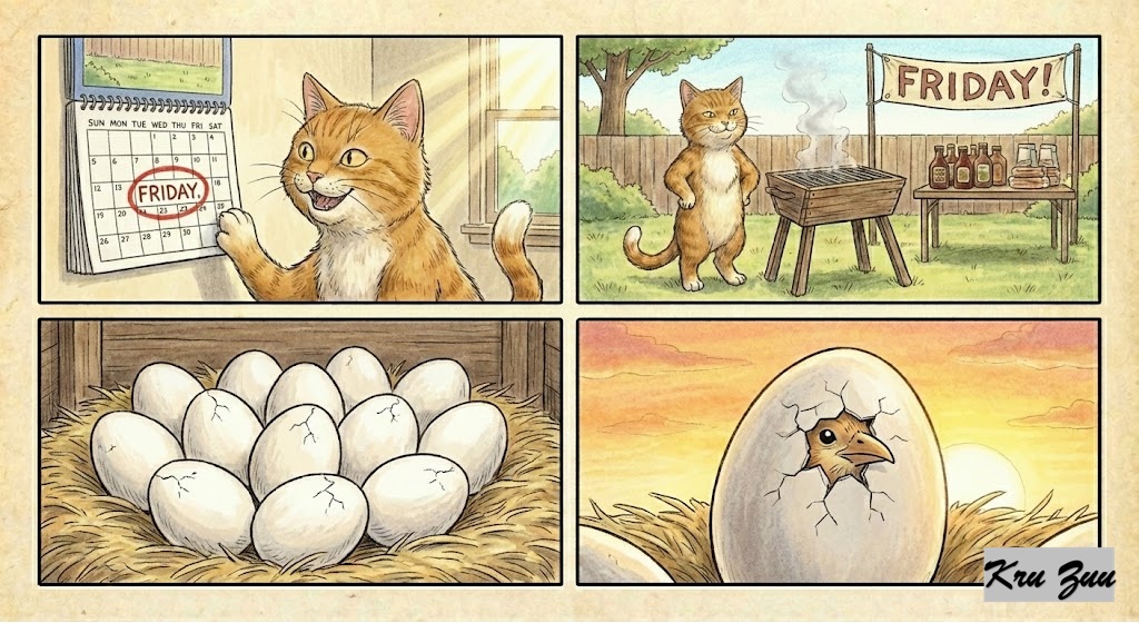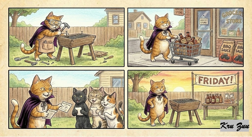 Whiskers spent the whole week building a grill and buying BBQ sauce. He told all the neighborhood cats, “Come to my house on Friday! Huge feast!”