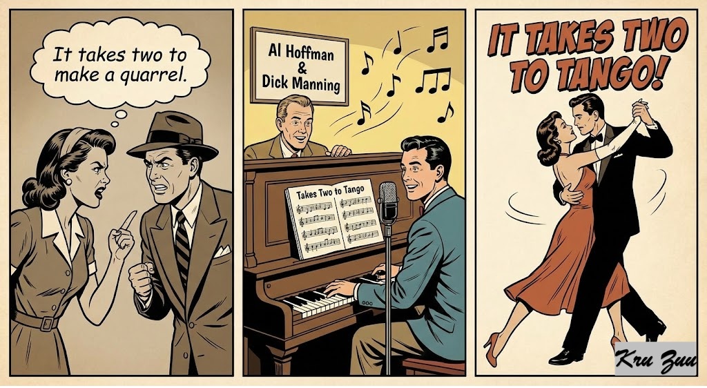 The Origin: It was popularized by the catchy song “Takes Two to Tango” written by Al Hoffman and Dick Manning in 1952. Before this, people simply said “It takes two to make a quarrel.”