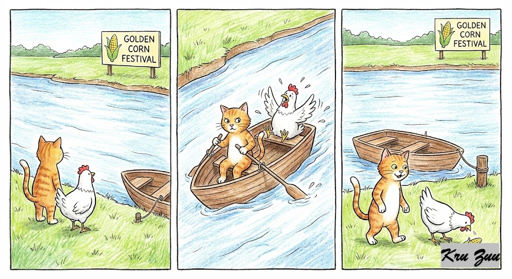 The Conflict: They jump in the boat. Cleo (Cat) grabs the left oar. She wants to row gracefully and slowly so she doesn’t get her fur wet. Cluck (Chicken) grabs the right oar. He is excited! He flaps his wings and rows furiously fast to get to the corn.