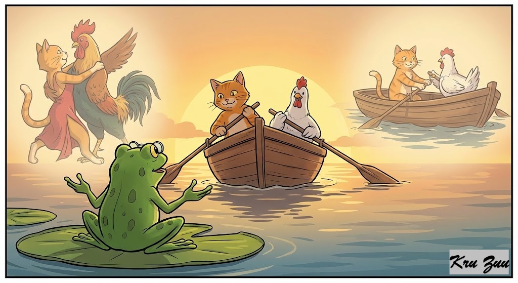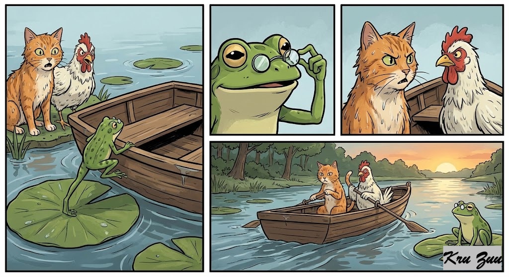 The Resolution: Fred the Frog hops onto a lily pad next to the boat. He adjusts his tiny glasses. “Ribbit,” Fred says calmly. “Cleo, you are steering left. Cluck, you are steering right. The boat doesn’t care who is ‘right.’ The boat only moves if you find a rhythm.”