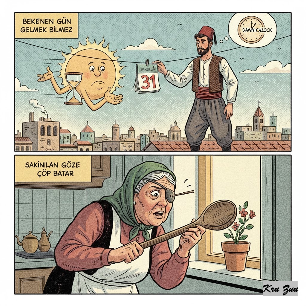 🇹🇷 Turkish:“Beklenen gün gelmek bilmez” (The awaited day does not know how to come) or “Sakınılan göze çöp batar” (A stick pokes the protected eye – focusing too much causes issues).