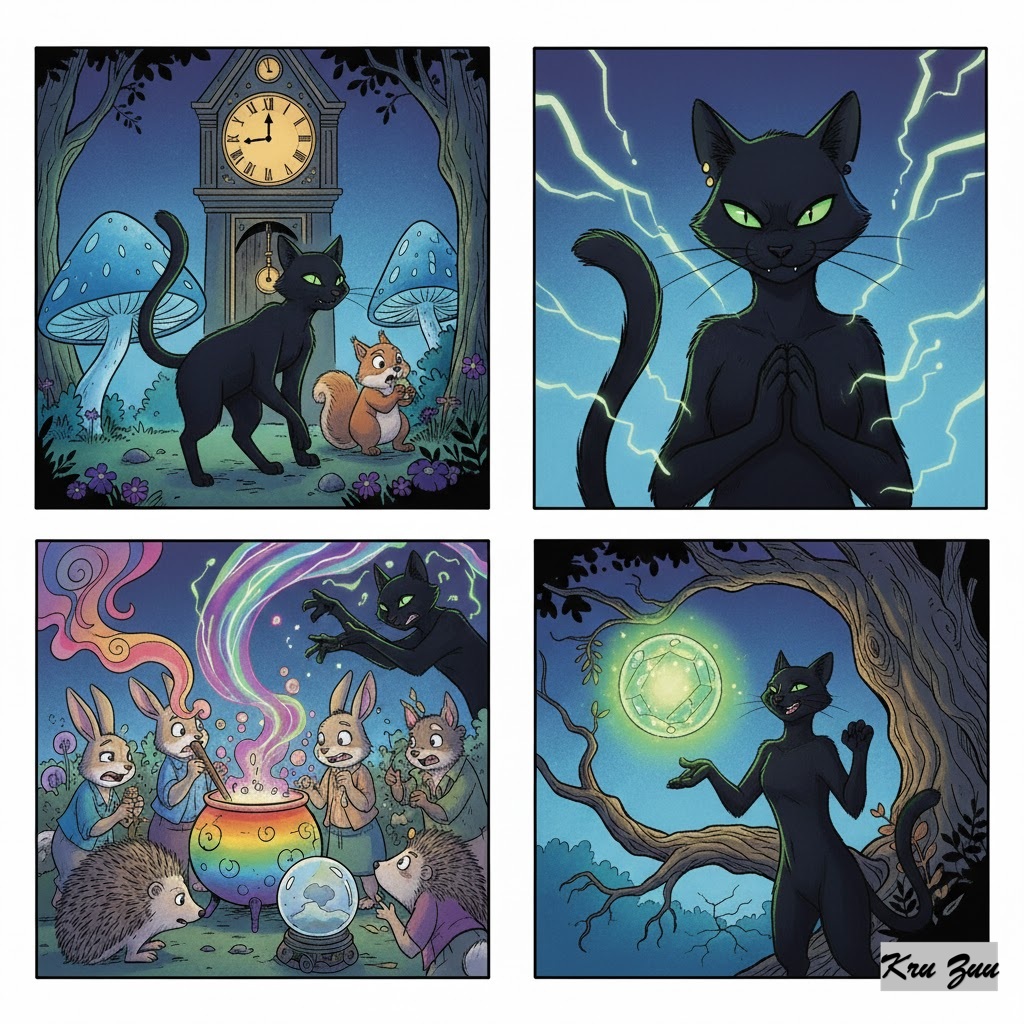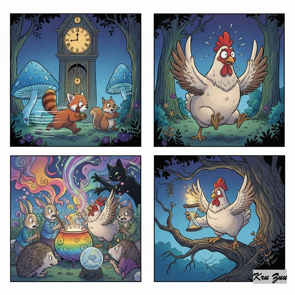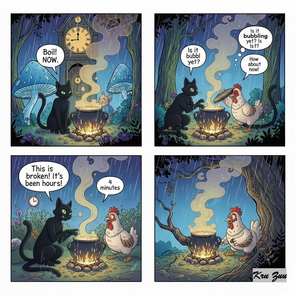 The Conflict: They put the heavy iron pot on the fire. Cleo sits directly in front of the pot. Her tail twitches. She stares at the water with intense green eyes. “Boil,” she commands. “Boil NOW.” Cluck is even worse. Every 30 seconds, he lifts the lid to peek inside. “Is it bubbling yet? Is it? How about now?” 🐔 By lifting the lid, Cluck lets the heat escape! By staring at it, Cleo makes the 10 minutes feel like 10 years. “This is broken!” Cleo yells. “It’s been hours!” (It had been 4 minutes).
