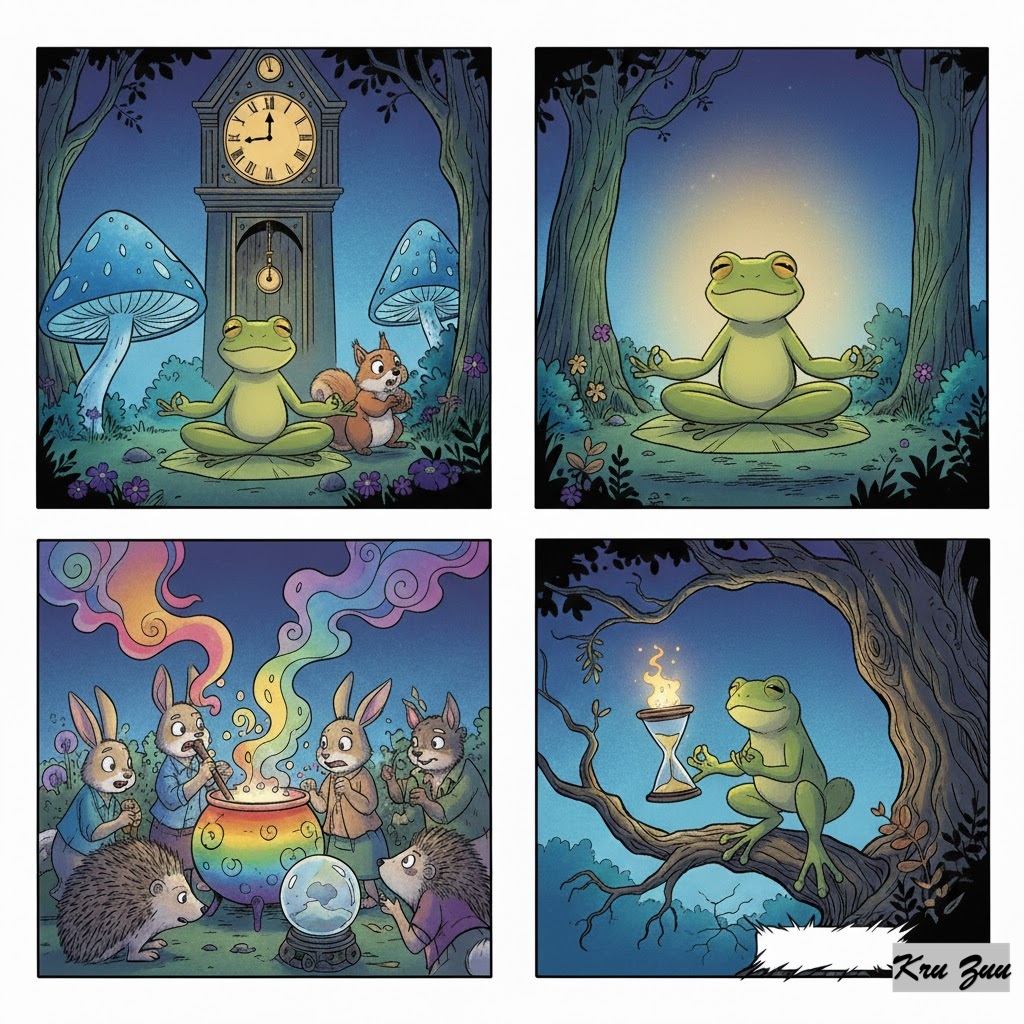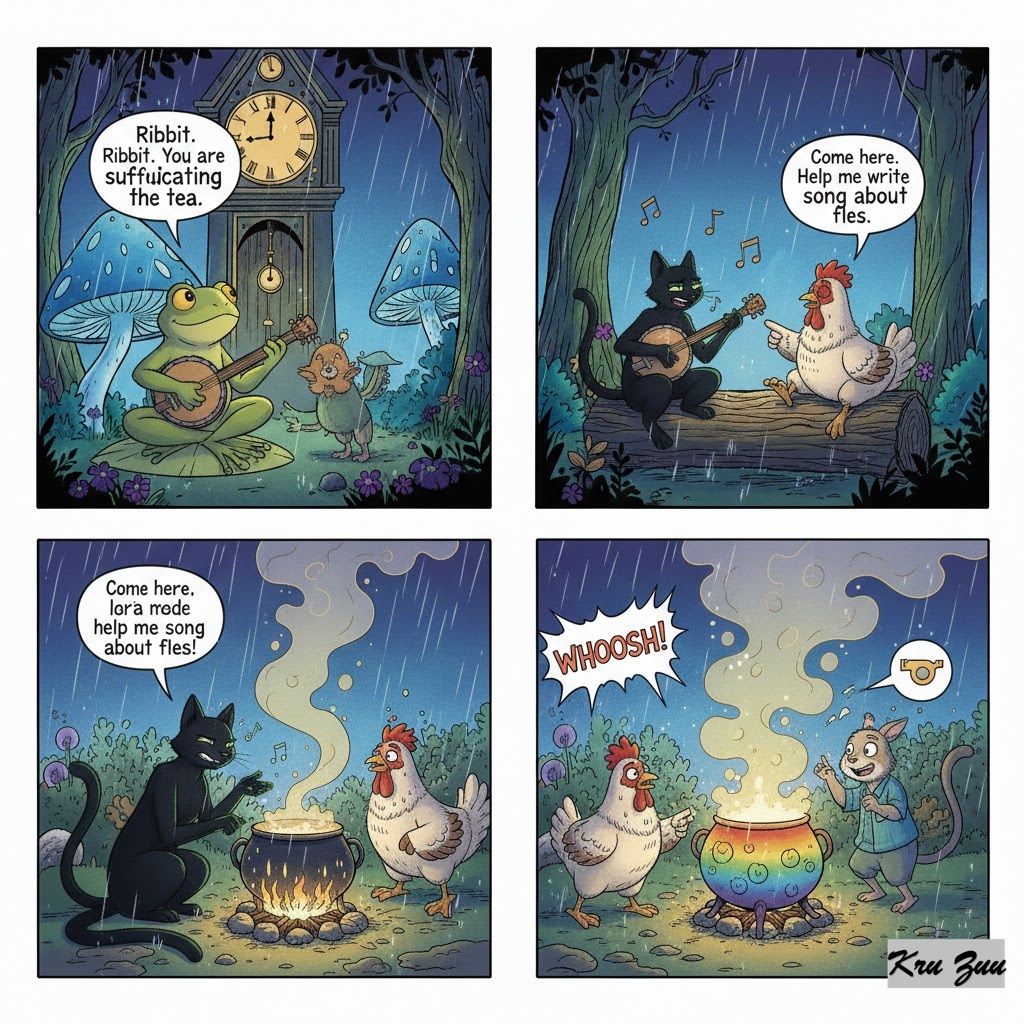 The Resolution: Fred the Frog hops into the kitchen, carrying a banjo. He sees them stressed and staring at the silent water. “Ribbit,” Fred croaks. “You are suffocating the tea.” Fred starts to play a happy song on his banjo. 🎶 “Come here,” he says. “Help me write a song about flies.” Reluctantly, Cleo turns away from the stove to correct Fred’s lyrics. Cluck starts dancing to the music. They laugh. They argue about rhymes. They forget the kitchen exists. WHOOSH! 💨 Suddenly, steam whistles from the pot! The water is boiling vigorously.