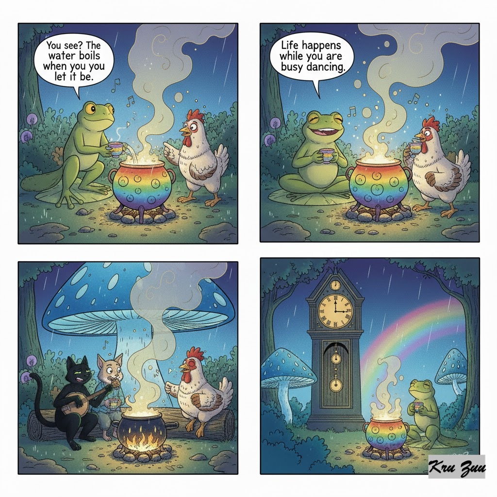 The Moral: Fred pours the tea. “You see?” he smiles. “The water boils when you let it be. Life happens while you are busy dancing.”