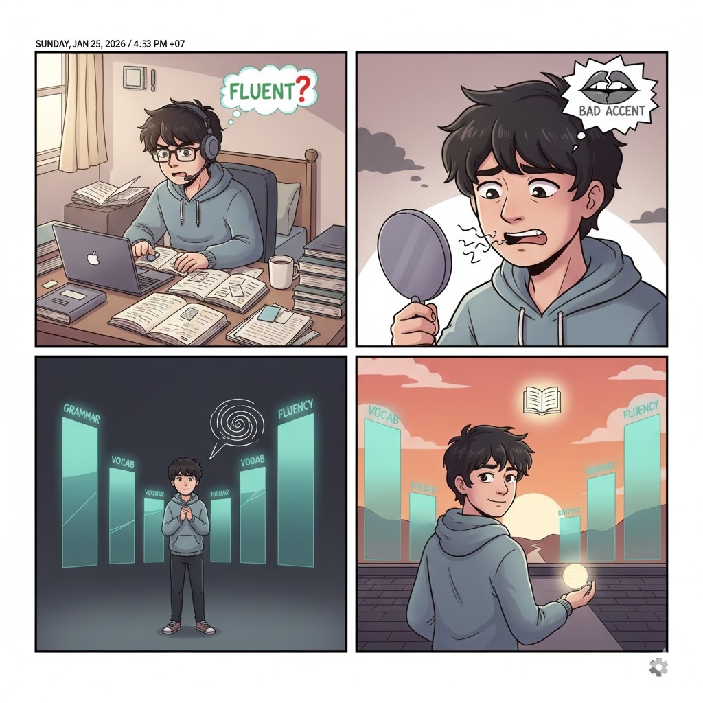 Situation: You study English every day. You constantly ask yourself: “Am I fluent yet? Why is my accent still bad?”
