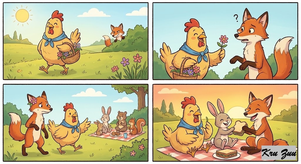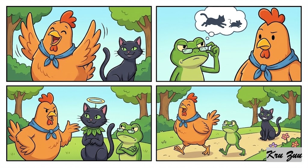The Conflict: Cluck is thrilled. “Oh, how wonderful!” Cluck chirps, flapping his wings. “I always knew you were good deep down, Cleo! We will be there!” Fred the Frog adjusts his glasses and frowns. “Ribbit. I don’t know, Cluck. She ate a mouse last Tuesday. A leopard or a cat, doesn’t change its spots.” “Don’t be so negative, Fred!” Cluck scolds. “She has changed!”