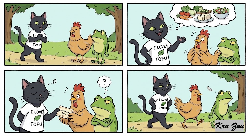 The Situation: Cleo the Cat approaches Cluck and Fred. She is wearing a shirt that says “I Love Tofu.” “Good news!” Cleo purrs smoothly. “I have decided to change my lifestyle. I am no longer a hunter. I am a vegetarian now. I want to invite you both to lunch to celebrate my new life.”