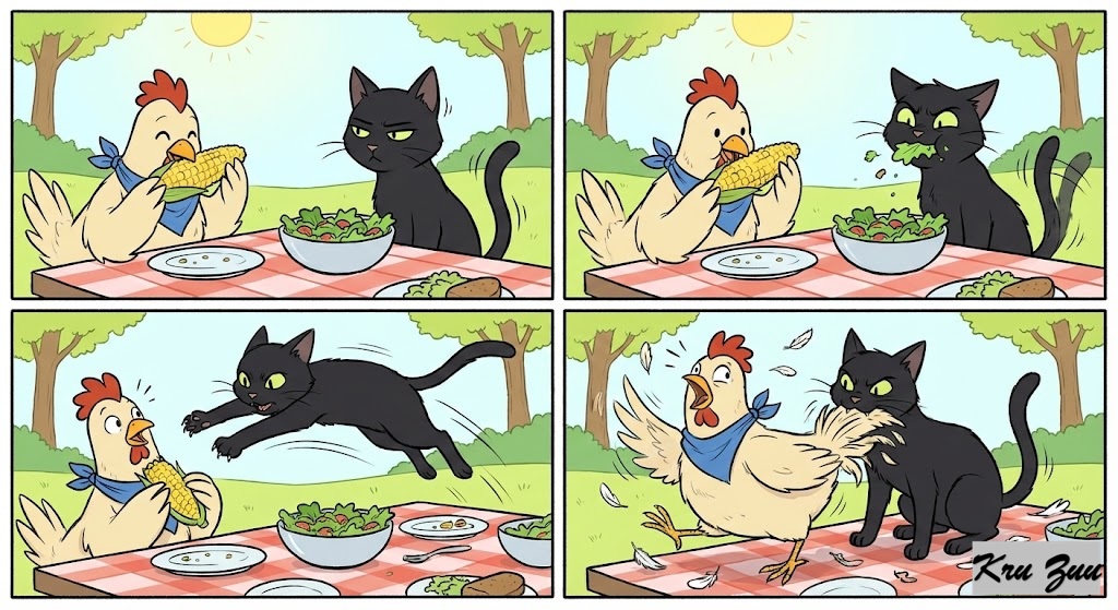 The Lunch: They sit down at the picnic. There is a bowl of salad. Cleo tries to eat a leaf of lettuce. She chews itโฆ and spits it out. She looks at Cluck. Her eyes get wide. Her tail starts to twitch. ๐ Cluck is busy eating corn. “This is great, Cleo!” Suddenly, Cleo lunges! POUNCE! She jumps across the table, aiming right for Cluck’s feathery tail!
