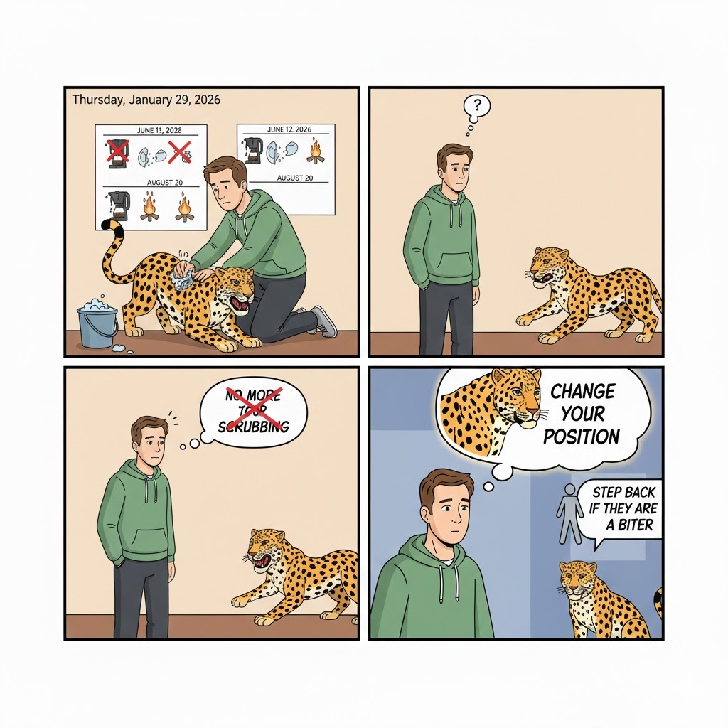The Action: Stop trying to scrub their spots off. Instead, change your position. If they are a biter, step back so they can’t bite you.