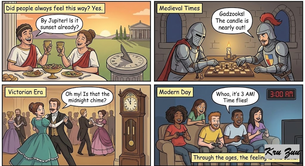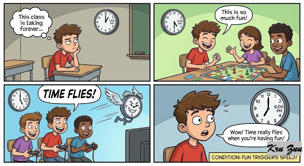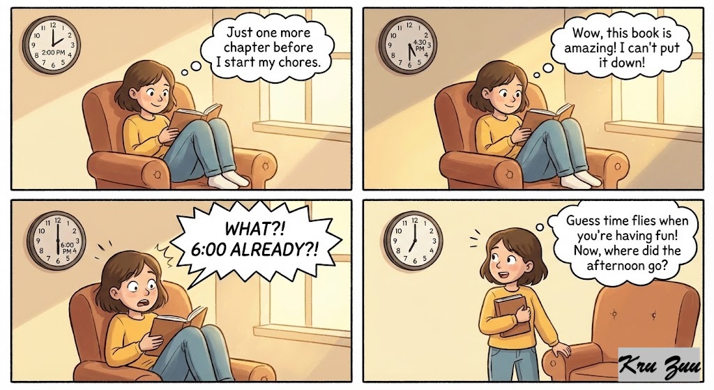 You sit down to play your favorite video game, paint a picture, or talk to your best friend. You feel excited. You are 100% focused. You don’t look at your phone. You don’t look at the clock. Suddenly, your stomach growls. You look up. It was 8:00 PM when you started… now it is midnight! 🌑 “Where did the time go?” You are the Flow Master. Because your brain was happy and engaged, you skipped the boring parts of time.