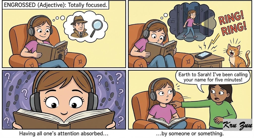 Engrossed (Adjective): Having all one’s attention or interest absorbed by someone or something. (Totally focused). 🧠