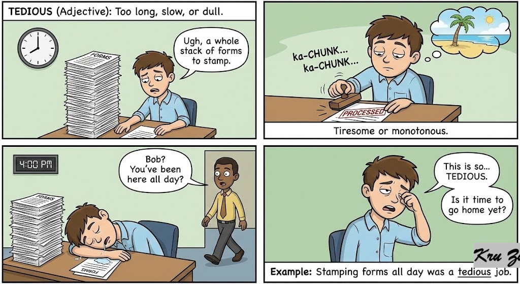 Tedious (Adjective): Too long, slow, or dull; tiresome or monotonous.
