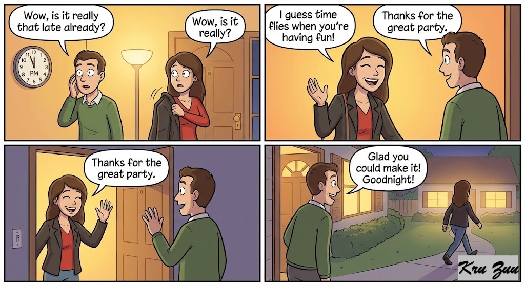 Guest: “Wow, is it really? I guess time flies when you’re having fun! Thanks for the great party.”