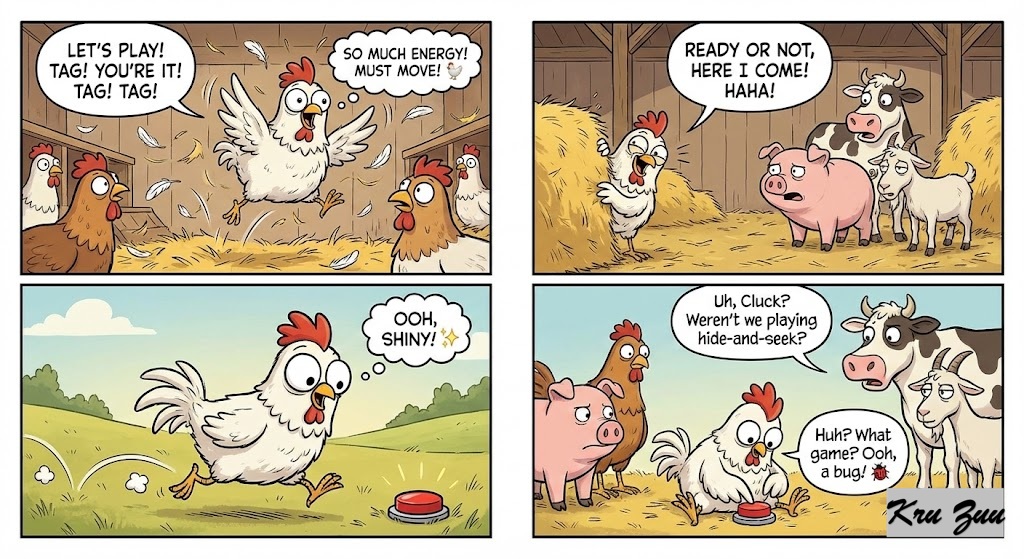 Cluck the Chicken: Hyperactive, loves games, loses focus easily. 🐔