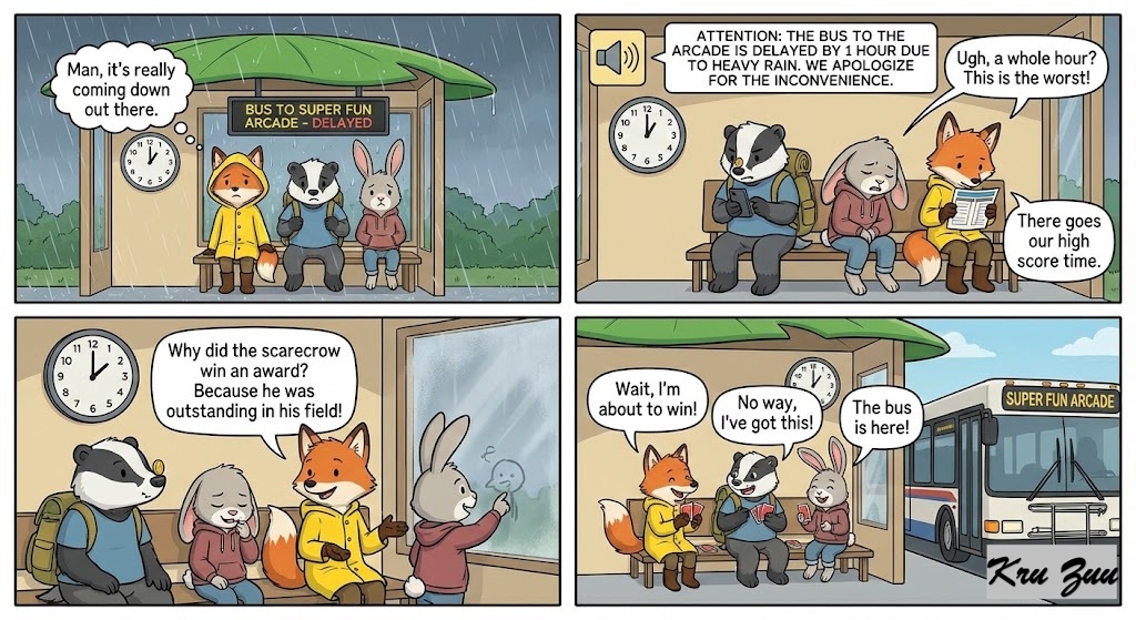The Situation: It was pouring rain. The three friends were stuck inside the “Lily Pad Station” waiting for the bus to take them to the “Super Fun Arcade.” The bus was delayed by 1 hour.