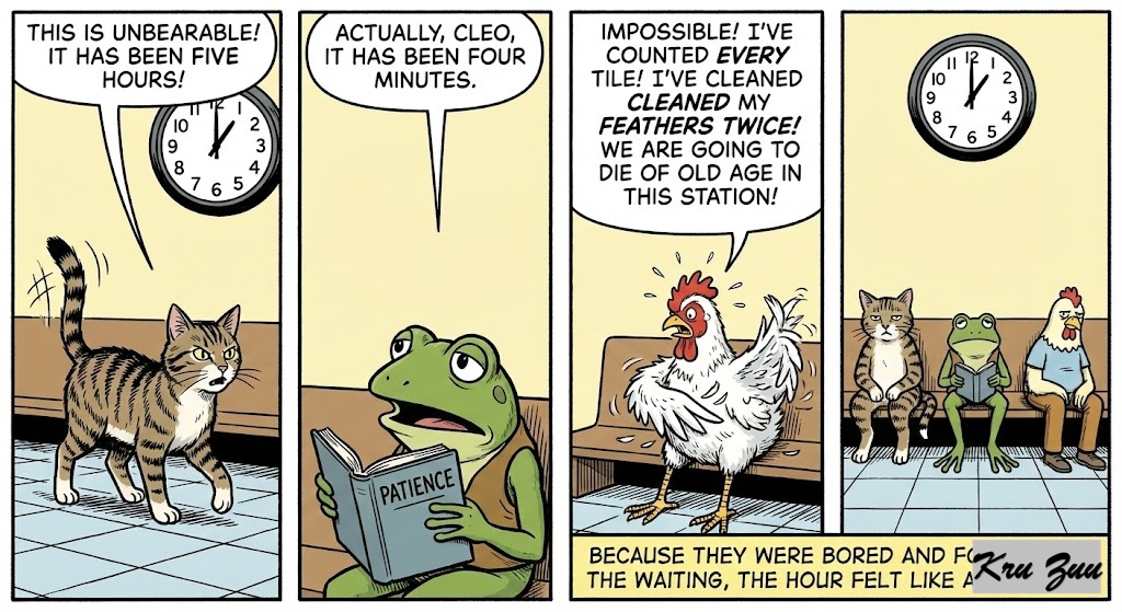 Part 1: The Torture (The Waiting Room) Cleo paced back and forth, swishing her tail angrily. She stared at the clock on the wall. Tick… tock… tick… tock. “This is unbearable!” Cleo hissed. “It has been five hours!” Fred looked up from his book. “Actually, Cleo, it has been four minutes.” “Impossible!” Cluck squawked. “I have counted every tile on the floor. I have cleaned my feathers twice. We are going to die of old age in this station!” Because they were bored and focused on the waiting, the hour felt like a century. 🐢