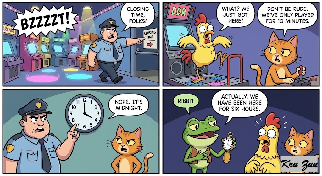 The Lesson: “Six hours?!” Cluck screamed. “But it felt like a blink of an eye!” Fred adjusted his glasses. “Precisely. In the station, you stared at the clock, so time crawled. Here, you stared at the fun, so time flew.” Cleo sighed, looking at her high score. “Well,” she purred, “At least the time flew in first class.”